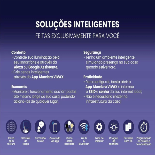 - Agora você já pode controlar a iluminação dos ambientes por comandos de voz, wi-fi, Bluetooth e Touch;